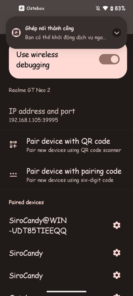 B2: Nhấn nút Pair , cấp quyền thông báo cho app .Sau đó mở tuỳ chọn nhà phát triển trong cài đặt -> Bật gỡ lỗi wifi -> Ghép nối thiết bị bằng mã ghép nối.