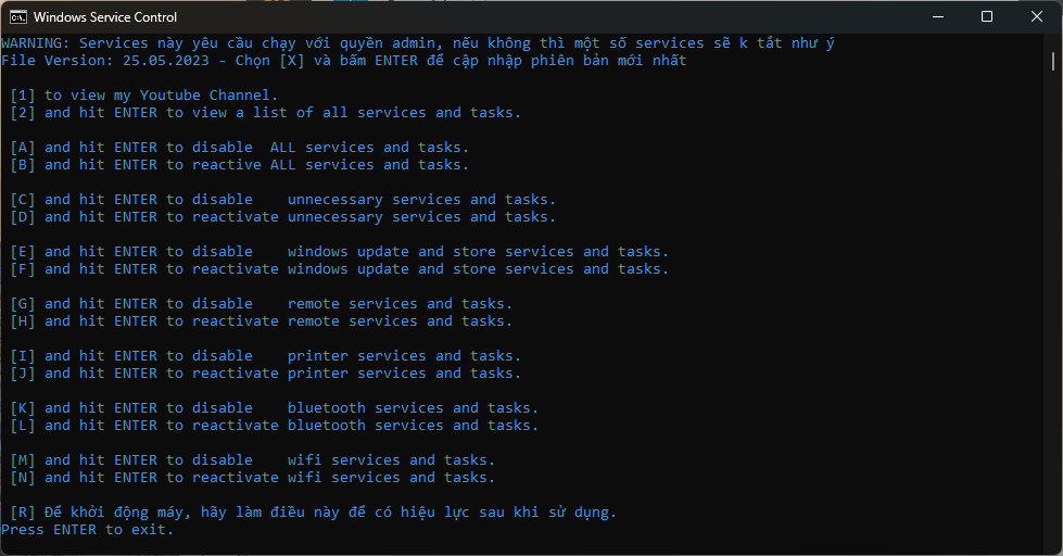 Một công cụ file batch tối ưu hoá services, tasks trên máy tính windows giúp lược bớt được các dịch vụ không cần thiết trên máy tính giúp cho thiết bị hoạt động trơn tru hơn và mượt mà hơn thông thường.