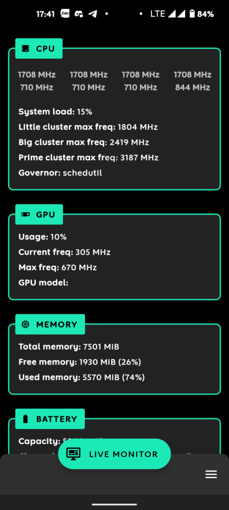 Gồm nhiều các tính năng tinh chỉnh điện thoại chúng ta, bao gồm tuỳ chỉnh CPU,GPU,RAM,Pin,… Và một số các tính năng đặc biệt khác như là Live Monitor (Hiển thị đo FPS, xung nhịp CPU,GPU,… Thông qua overlay )