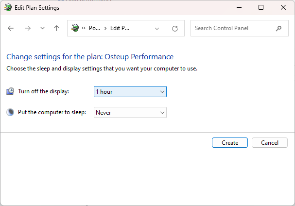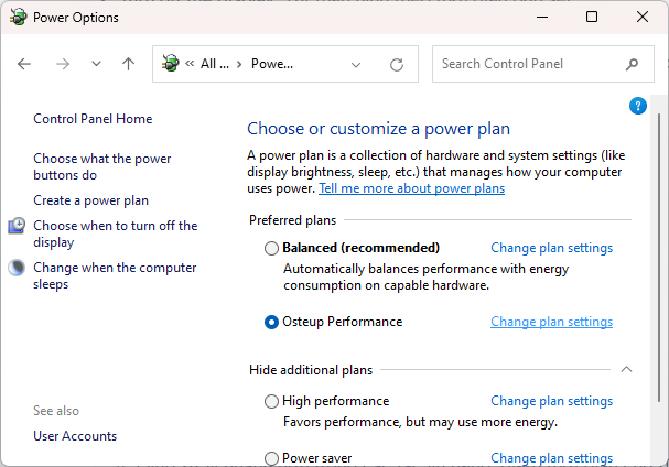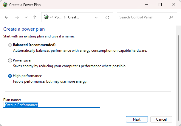 Chọn High Performance -> Đặt tên “Osteup Performance” -> Next