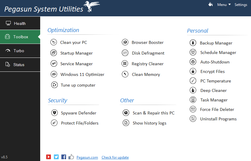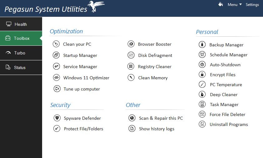 Tối ưu máy tính windows 10 hoặc 11 bằng phần mềm Pegasun System Utilities. Phiên bản free bao gồm các tính năng tối ưu cho máy tính của bạn khiến thiết bị trở lên mượt mà hơn thông thường.
